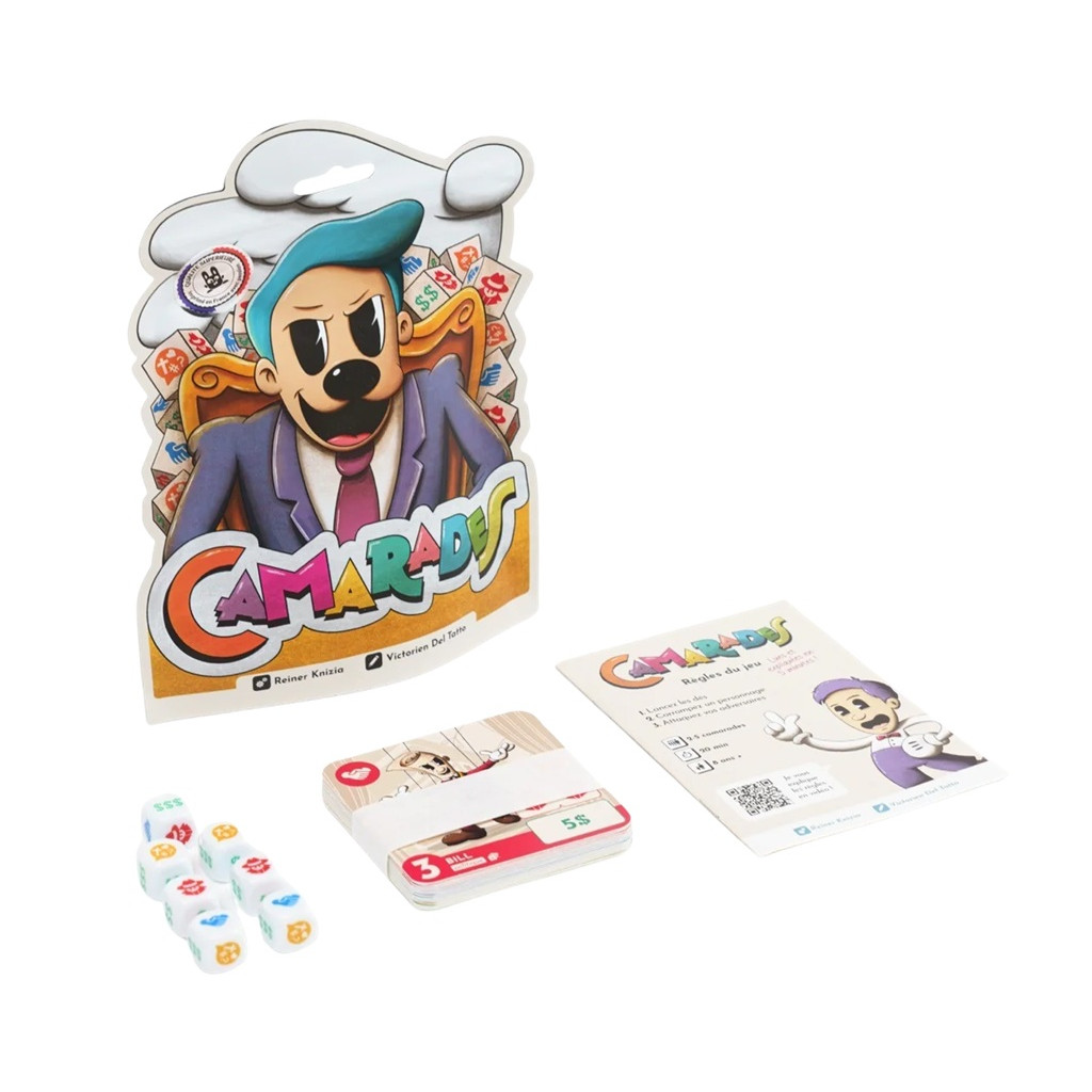 Par rapport aux autres jeux de dés, Camarades se distingue par son aspect vachard et jouissif. Il combine l’intensité du Risk avec une dimension euphorisante du Yam’s ou de Pickomino. Ce jeu est parfait pour celles et ceux à la recherche d’un jeu plein de coups d’éclat à jouer entre amis à l’apéro ou en famille, entre enfants ou entre adultes, que vous soyez aussi bien 2 que 5 camarades de jeux autour de la table (basse).
